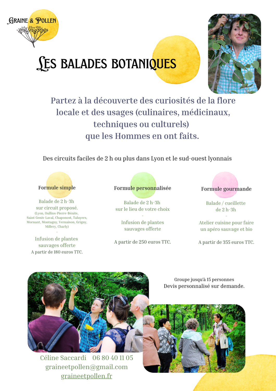 Infos pratiques : Chaque balade dure entre deux et trois heures environ, sur un parcours souvent facile et court (on s'arrête beaucoup pour admirer, sentir, toucher les plantes). Elle sera agrémentée d'une dégustation et un document récapitulatif vous sera transmis par la suite.